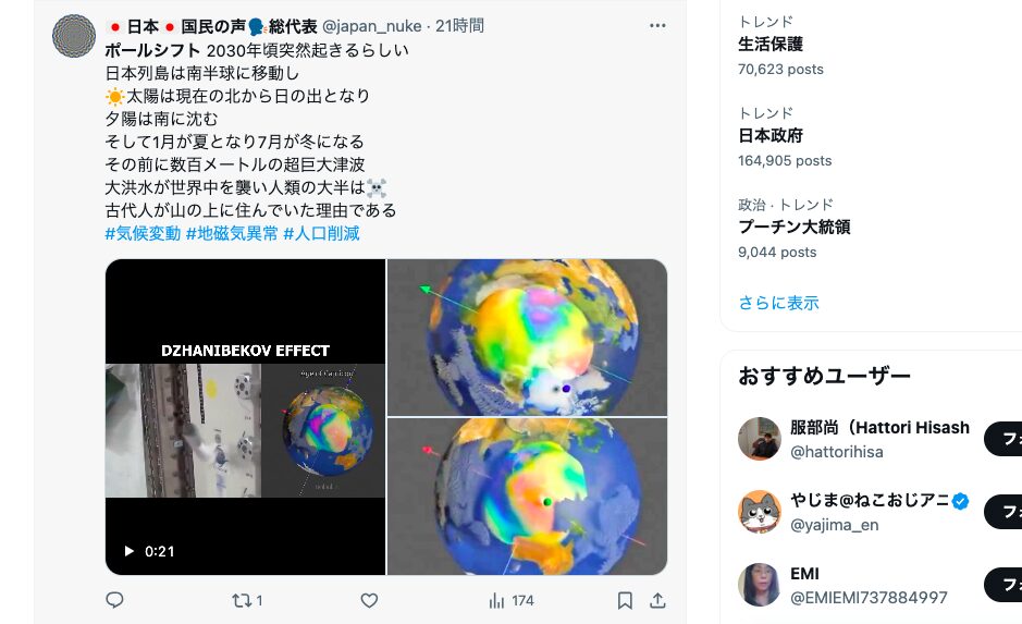 まあ、日本が南半球に移動する頃には、日本は海の底になっている。北極と南極の氷も溶けるし、地球の遠心力で赤道付近の海面が上昇します。上の画像のポストを見ると2030年となっているが、僕は前に調べたときは、数千年かけてじわりじわりと起こる感じだと理解していた。